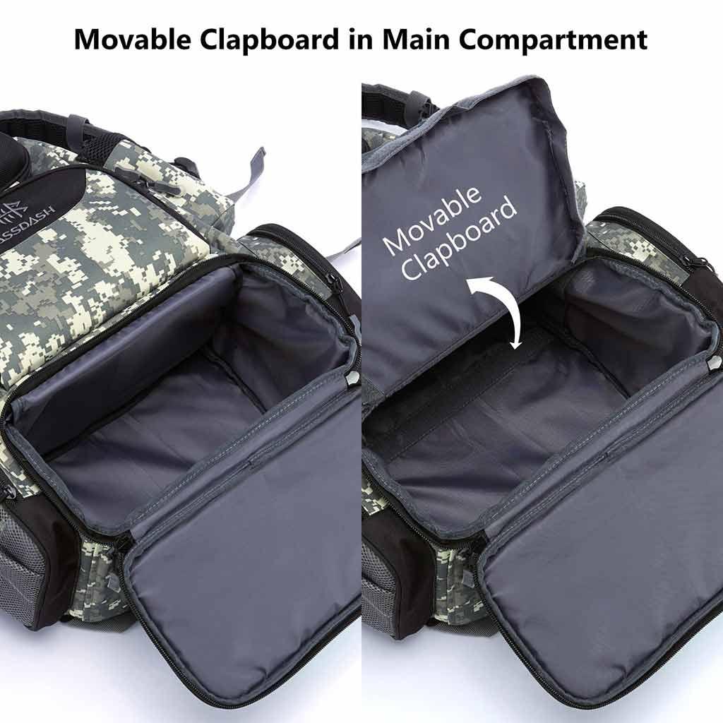- Adjustable main compartment can be divided into 2 separate inner compartments with movable clapboard in the main compartment: Top compartment to store personal items; Lower compartment holds up to 3 large 3600-size (10.71” x 7” x 1.65”) utility boxes (not included)
